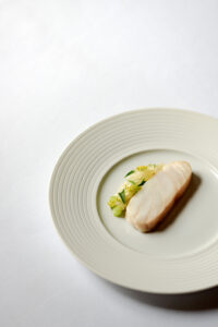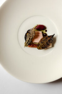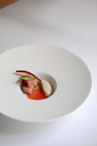 He recalls a standout pairing: ‘A summery dish of British line-caught tuna, using the rich toro, served raw with pineapple-weed custard, pickled green strawberries, and British plums. We matched it with The Wharie Experience, a dark saignée rosé. Its freshness balanced the fatty richness of the fish, while echoing the fruit in the accompaniments. The wine is the work of Guillaume Lagger, a Swiss oenologist we collaborate with directly. He launched a micro-winery in Hampshire in 2020, initially vinifying neighbours’ grapes while he established his own PIWI plantings. Today he works with Orion and produces a skin-contact Bacchus.’