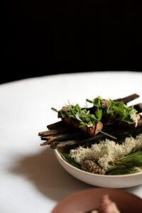 That alignment runs through the food itself. ‘We’re hyper seasonal. Proteins are broken down by us – we work closely with Herefordshire farmer, Tom Jones, who raises native breeds; whole or half carcasses come in.’ The dry-ager is on view to guests, turning the dining room into a kind of studio where ideas cure in public.